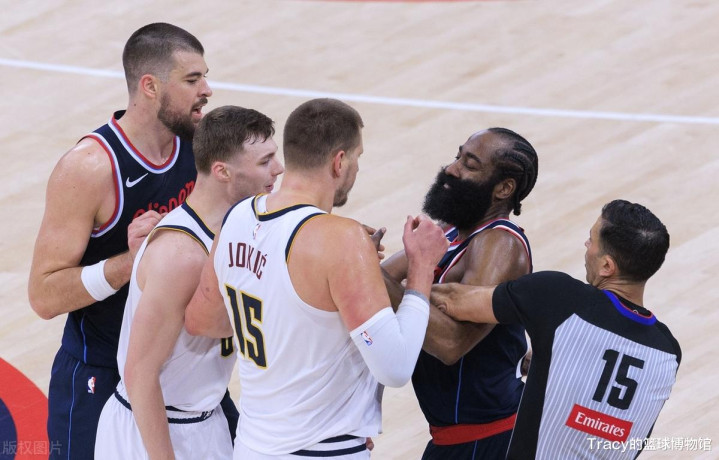 第二节快船最后一攻,哈登被布劳恩犯规以后,两人发生口角,结果约基奇和戈登都冲上来了。哈登因为上半场裁判无耻黑哨,偏袒掘金,忍无可忍暴怒!罕见地动手,推了约老师和戈登。